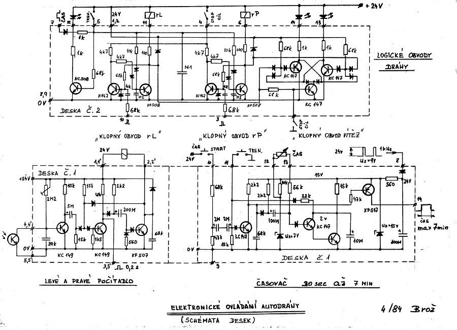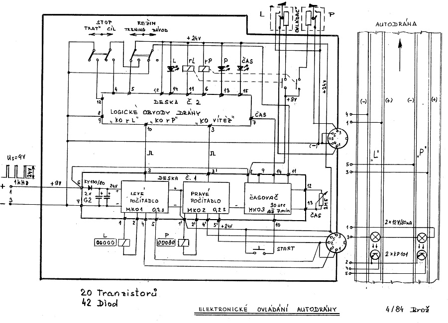 K pulznímu zdroji (1) i k ovládání autodráhy (3) mám k dispozici kompletní schémata zapojení. Ovládač autodráhy byl navržen pro ten pulzní zdroj. Napájení 24V pro elektroniku je odvozeno z pulzů 24V v režimu 0 až 24V nabíjením kondenzátorů přes diodu. Je to z toho důvodu, že jsem sehnal jen elektromechanická počítadla na 24V. Střední napětí pro jízdu autíček se může nastavit téměř od nuly po maximální hodnotu, při které "pilot" ještě stačil autíčka ovládat. Obvykle se nastavilo kolem 10V.