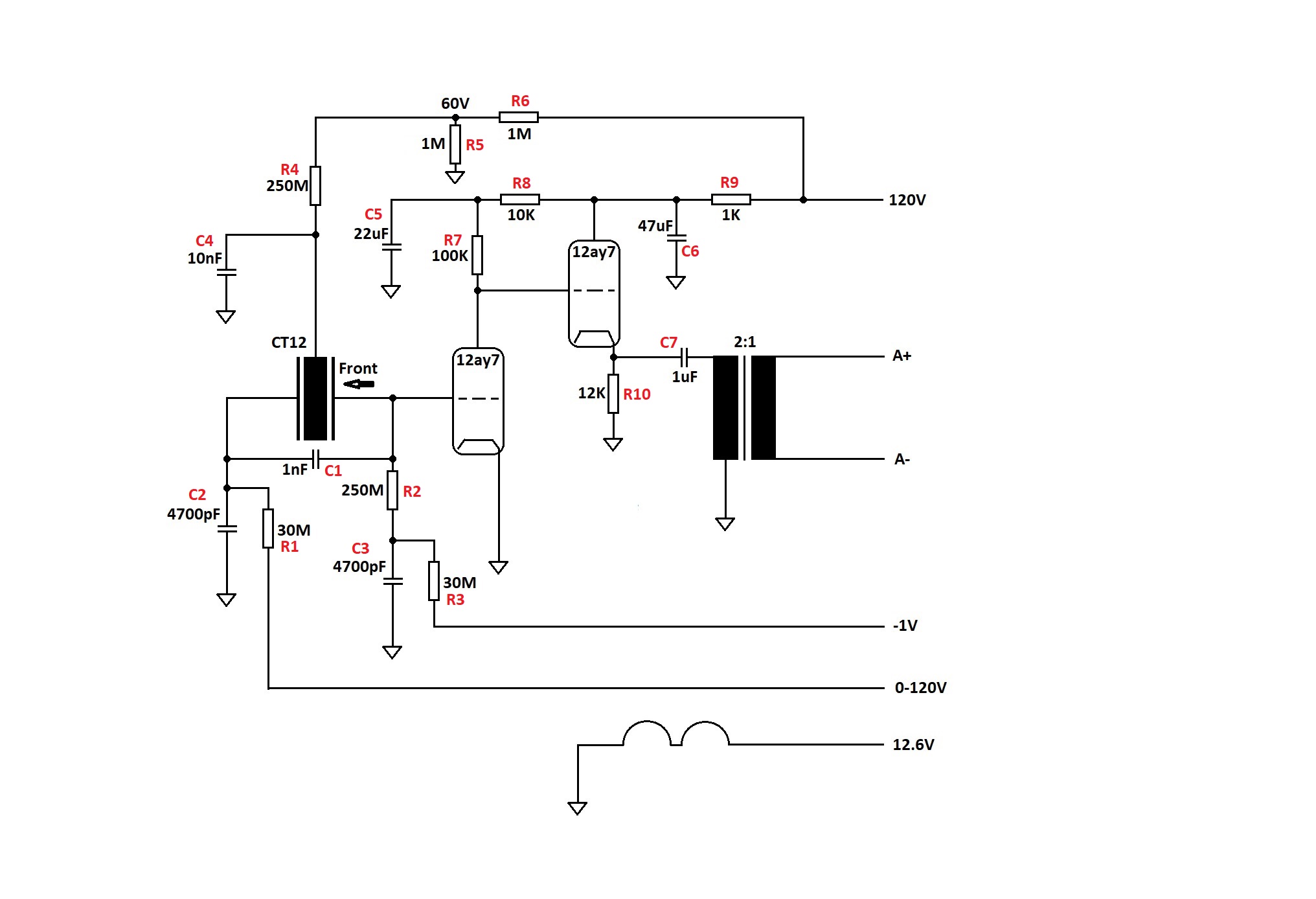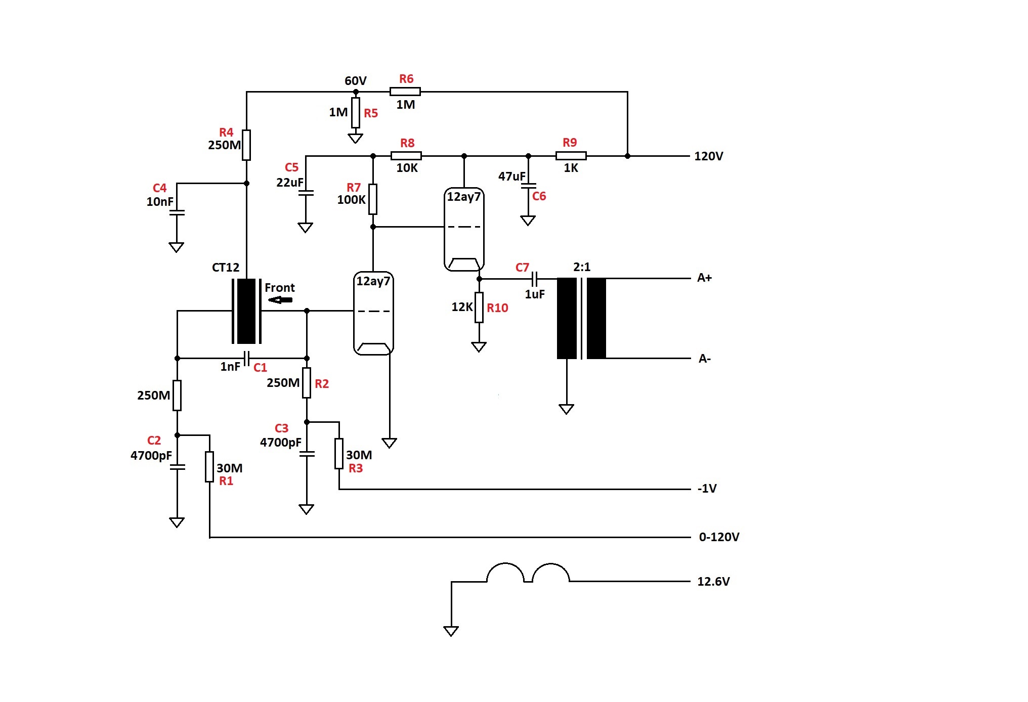 Jedná se o takovou složeninu mikráku AKG C12 (uzemněná katoda, externí bias -1V), Neumannu M49 (dělič ze 120V, vstupní sekce) a taky zde kdysi publikovaného obvodu mikráku člena Sendyxe.