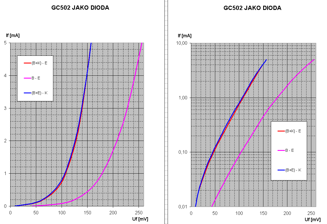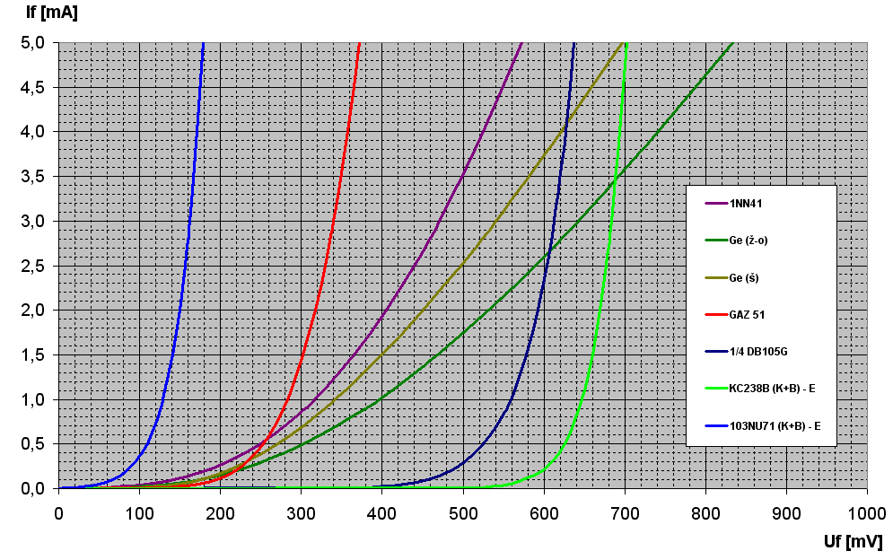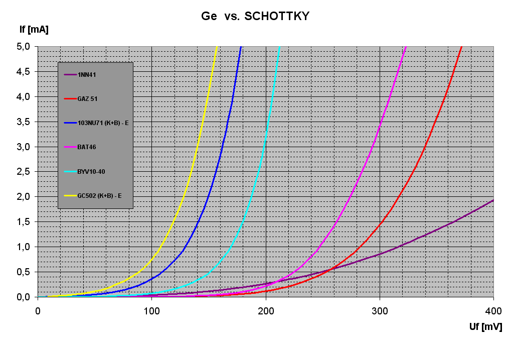 Ze Schottkyho diod jsem narychlo našel po šuplíkách jenom BAT46 a BYV10-40. Výsledky měření jsem dal do jednoho grafu i s těmi Ge tranzistory. To Ge sice o kousek, ale přece jenom vítězí ... . Pravda ovšem je, že ty BAT46 i BYV10-40 jsou typově pomalu 30 let staré ; modernější Schottkyho diody by v této "soutěži" možná dopadly jinak. V této části sortimentu jsem ovšem poněkud ztratil přehled - možná, že by k tomu mohl mít někdo aktuálnější poznatky.