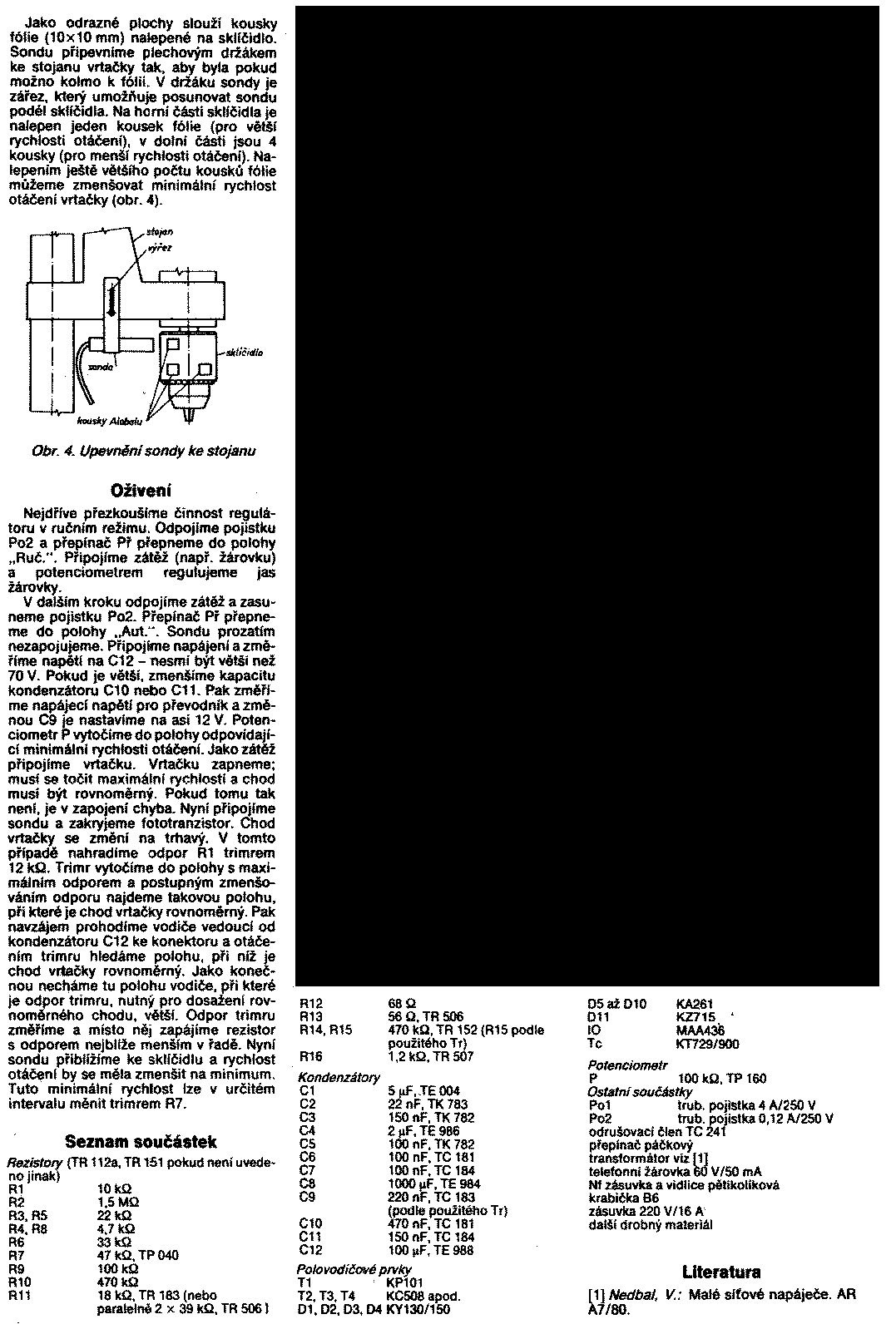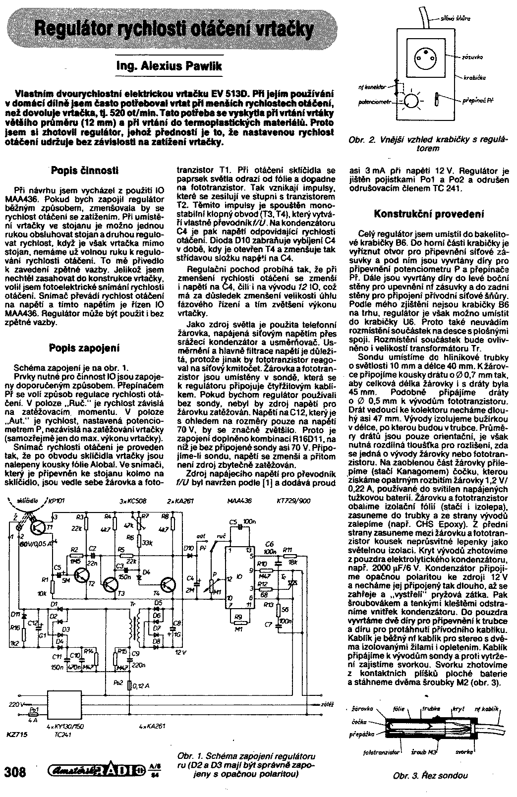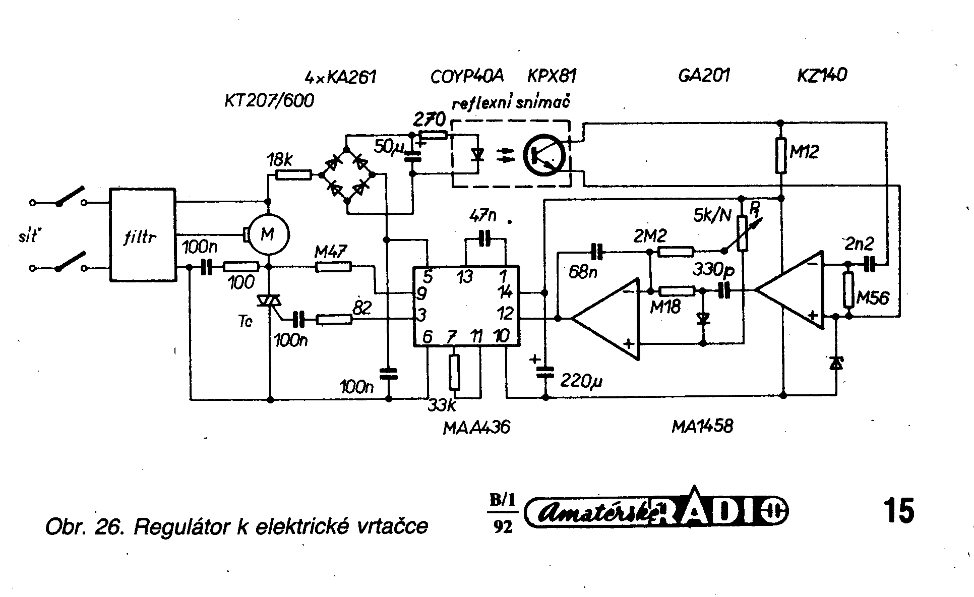 Tohle bylo v jednom Amáru někdy z 80.let - regulátor vrtačky pro stálý otáčky i při změně zatížení. Ale už si z hlavy nevybavím, jestli tam byl triak nebo tyristor a čím to bylo řízený, jestli MAA436 nebo nějakýma diskrétně poskládanýma obvodama. Snímání otáček ze sklíčidla ale bylo tutově bezkontaktní = optikou, odrazným snímačem s kouskem lesklý nálepky na sklíčidle. _________________ Nasliněný prst na svorkovnici domovního rozvaděče: Jó, paninko, máte tam ty Voltíky všecky...