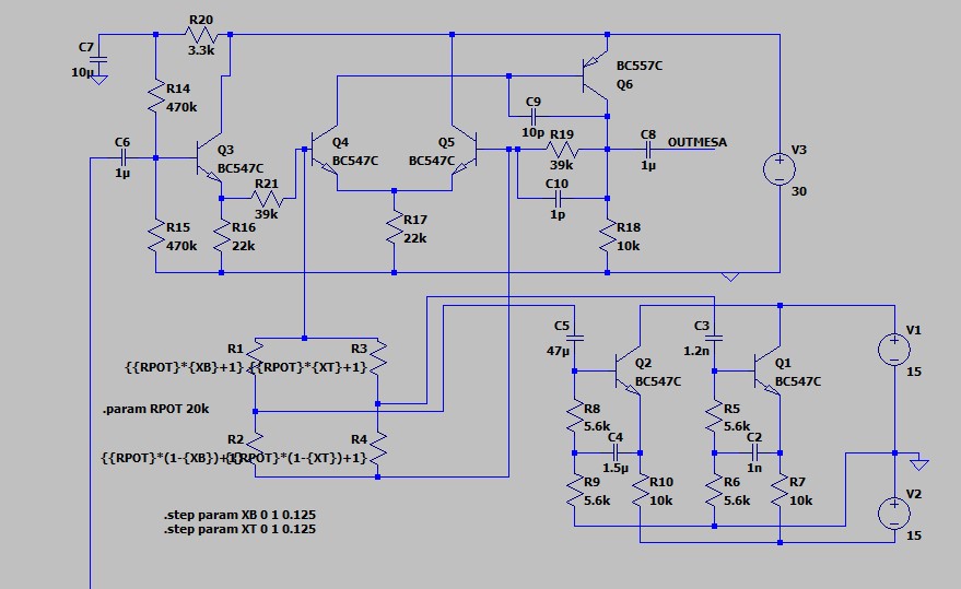 Na základě nápadu na tranzistorový korekční zesilovač jsem si v simulátoru LT-Spice začal hrát s gyrátory. Našel jsem pár zapojení, např Vermona Regent E2010, Mesa Boogie ekvalizér a podobně s cílem použít gyrátor na "shelving filtr", tj. korekce nízkých a vysokých kmitočtů. Po pár experimentech jsem dospěl ke schématu s šesti tranzistory vycházející z Mesa Boogie.