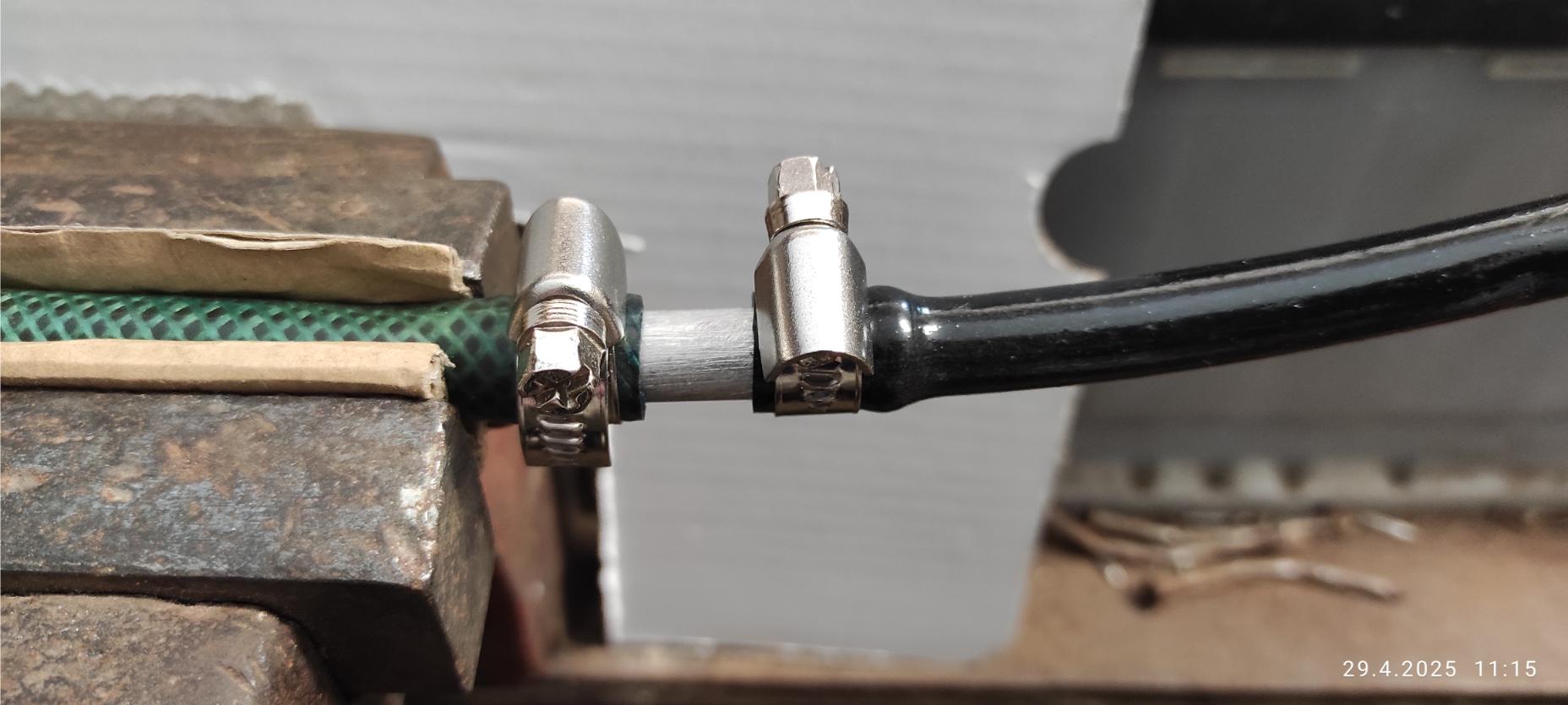 Říkám si dojde na řezání hadic a napojení pomocí trubičky. Dnes jsem pohledal ve svých zásobách a po chvíli mi padla do ruky tenkostěnná hliníková trubička o 2mm hrubší než vnitřní otvor hadic. Trubičku jsem uřezal, udělal pilníkem náběhy. převlečné matice jsem nechal na hadicích pro případné opětovné použití (kdybych je sundal už bych je asi v životě nenašel), konce hadiček jsem po jedné vždy nahřál horkovzduchem aby se celá dostatečně prohřála a trubička šla nasunout. Hadičky na té trubičce držely dostatečně ale pro jistotu jsem je ječtě zajistil šroubovacími sponami.