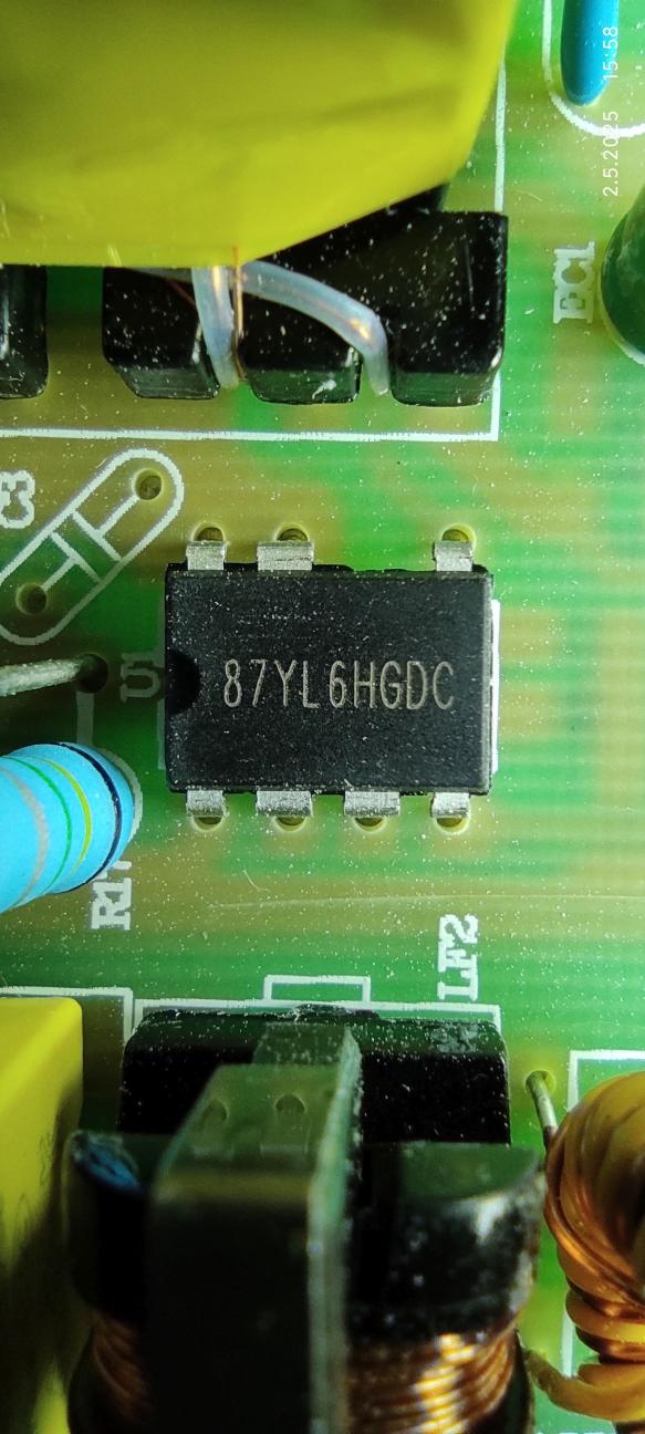 Zdravím všechny přítomné. Syn mi donesl tento 20W LED reflektor že mu přestal svítit. První co jsem provedl byla kontrola LED čípu která proběhla v pořádku takže jsem se pustil do měření LED zdroje. Až po IO U1 s označením 87YL6HGDC je napětí ale na výstupu zdroje není žádné. Chtěl jsem najít k tomuto IO datasheet ale google nic nenašlo. Proměřil jsem součástky kolem, diody, rezistory, kondenzátory, usměrňovací můstek ale vše vypadá být v pořádku takže jedině padlo podezření na ten IO a pak už jenom trafo.