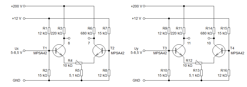 Co je mi ale divný je, že X-ové ose stačí +-60 V pro plnej rozkmit, ale Y-ová potřebuje +- 80 V. Je to normální, že jsou rozdílný citlivosti?
