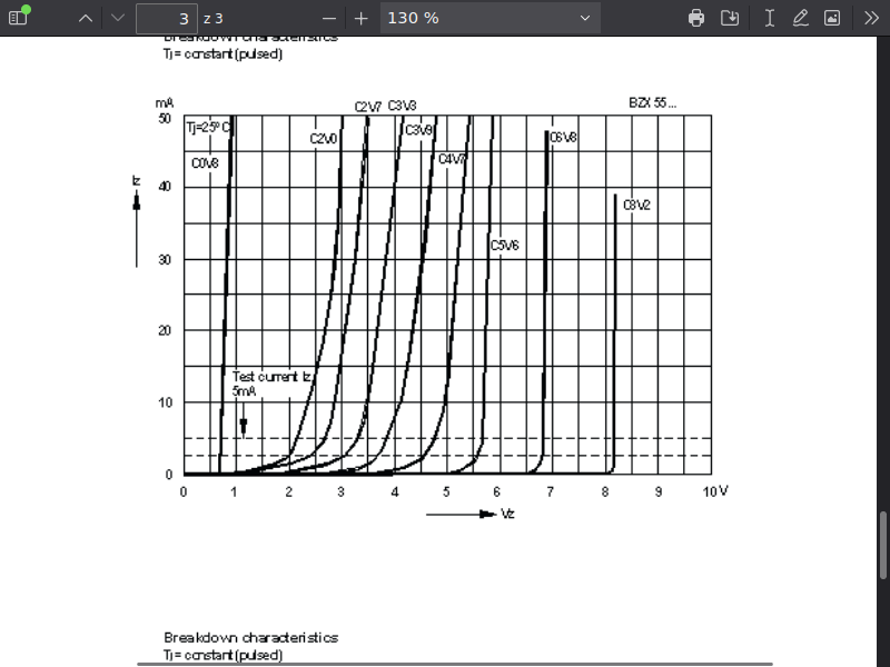 Jinak, ještě bych upozornil na to, že podle toho grafu při proudu 130mA bude na té zenerce už dost přes 4V. Takže když se odpojí ta zátěž, tak to napětí dost vyskočí nahoru.