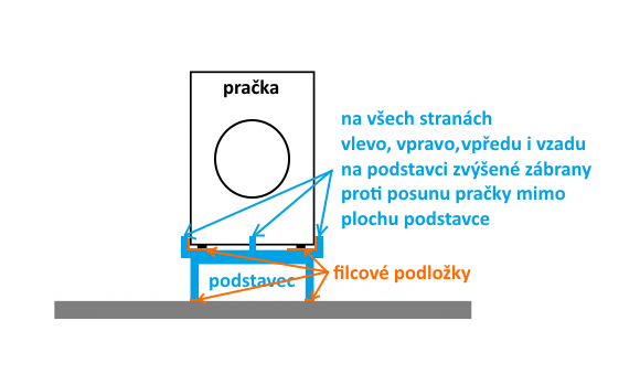 Když tak zkuste pouze filcové podložky a maximálně o tloušťce do 5mm. Kupte si třeba kus samolepícího filcu jako je tento a z něj si podle potřeby nastříhejte vhodné podložky. Pokud budete dělat ten podstavec tak nalepte filcové podložky na jeho nožky, na kterých bude stát na podlaze a také na místa kam bude na podstavec dosedat pračka, a to i na vnitřních bocích zvýšených zábran, proti posunu mimo plochu podstavce, o které se v dolní části může pračka opírat boky viz přiložený obrázek.