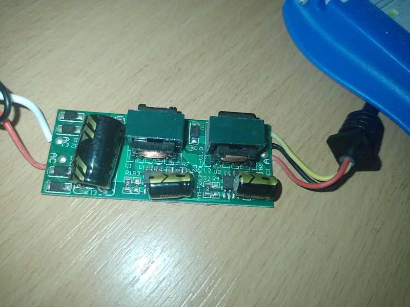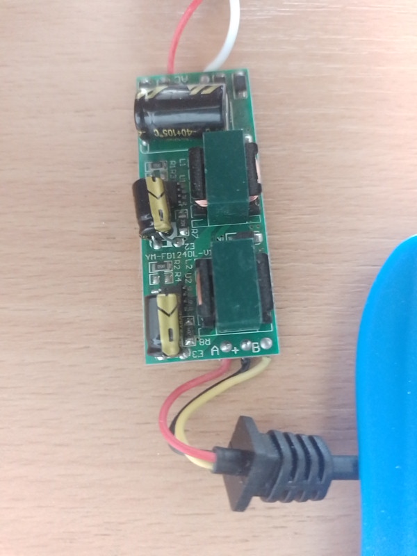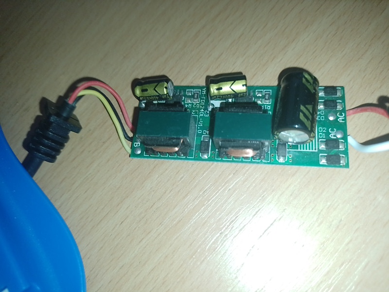 Výstupné napätie sa dá odhadnúť z dvoch menších elektrolytov. Sú to dva zdroje. Jeden pre biele, druhý pre modré LED. Z fotiek ale ťažko odhadnúť, či sú to napäťové, alebo prúdové zdroje. Ak svetlo prestalo fungovať odrazu, tak je chyba niekde v LED. Pravdepodobne odhnitý nejaký prepoj na spoločnom + čiernom vodiči. Totiž je malá šanca, že by sa oba zdroje, pre modré aj biele LED, pokazili naraz.