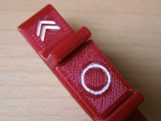 Dotaz na Jirku: Bylo by na barvení do drážky (ty dvojšipky a O) možné použít bílou akrylátovou barvu, takovou jak se prodává v malé tubě v hustotě zubní pasty nebo spíš nitro a párátko? V drážce by to mělo držet. Ty jsi laboroval s barvou na PLA. Nakonec, když žádná barva nebude, také se nic nestane.