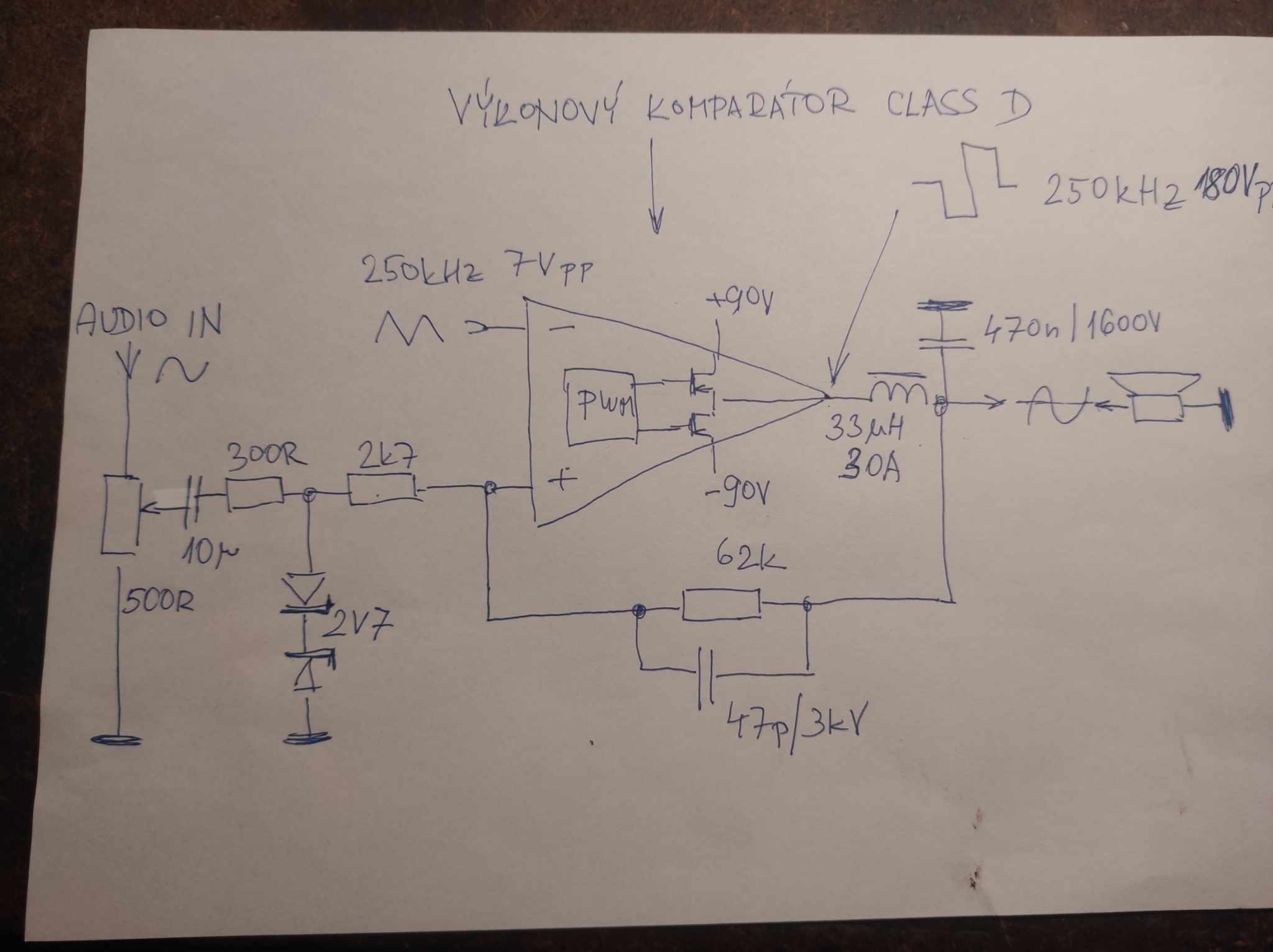 ...Samotný odpor 62k tvoří zápornou nízkofrekvenční zpětnou vazbu a zároveň udržuje šířku impulzů PWM, aby na výstupu bylo vždy 0VDC , když je napájení +-90V rozdílné v některé polaritě...