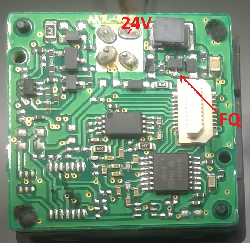 Fotka desky elektronického presostatu FESTO. Vlevo nahoře je nějaké zapojení spínaného zdroje - napájí se to 24VDC. Součástka s SOT23-3 má nápis FQ + nějaké tečky. Podle označení by to mohl být bipolární tranzistor, ale zapojení bez řídícího brouka nedává moc smysl.