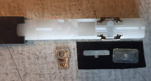 Mutingu chyběl jezdec s aretačním kolíčkem. Ten jsem použil ze síťového vypínače, nahrazeného novým.