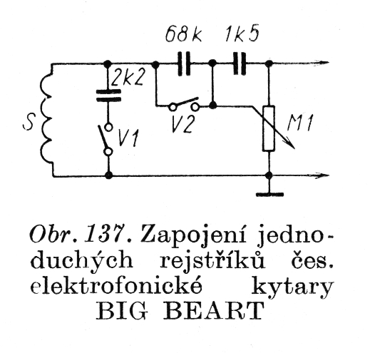 Možnost dodatečného zabarvení tónu mechanicko-elektrického hudebního nástroje znamená velmi výrazné zvětšení zvukové kombinační možnosti nástroje, který by jinak zněl jednotvárně. V nejjednodušším případě postačí zabarvení tónu jednoduchými obvody RC. S příkladem takového skromného zapojení jsme se setkali již na obr. 41b. Bylo určeno pro elektrofonickou kytaru nebo jiný nástroj toho druhu. Elektrické rejstříky továrně vyráběné kytary BIG BEAT, skládající se ze tří kondenzátorů, najdeme na obr. 137. Ve čtyřech kombinacích můžeme spínači V1 a V2 volit různé zvukové zabarvení (potenciometrem M1 lze nastavit výstupní hlasitost). Ke snímači S je přes spínač V1 paralelně připojen kondenzátor 2k2, který tvoří známou dolní propust. Uspořádání dalších dvou kondenzátorů není příliš šťastně voleno, protože při rozepnutém spínači V1 nejsou manipulace se spínačem V2 příliš účinné.