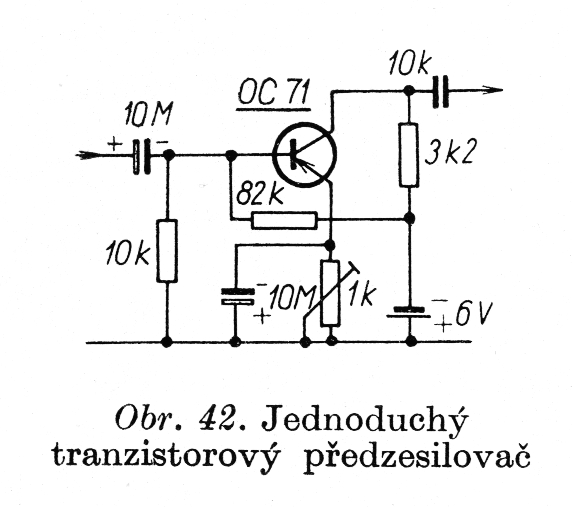 Zavedením zabarvení tónu snížíme poněkud celkové výstupní napětí snímače. Ještě více se napětí však sníží, pokusíme-li se uplatnit u nástroje některé speciálnější tónové rejstříky, které výrazněji pozmění barvu tónu. V takovém případě se neobejdeme bez malého tranzistorového předzesilovače, který by byl schopen alespoň pokrýt ztráty, které v obvodech rejstříků vzniknou. Jednoduché zapojení předzesilovače s jediným tranzistorem najdeme na obr. 42. Takový předzesilovač lze snadno vestavět přímo do kytary, protože je prostorově nenáročný (napájení tužkovými bateriemi nebo jinými typy miniaturních zdrojů). Současně s tímto předzesilovačem můžeme v případě dostatku prostoru vestavět do nástroje i některé z rejstříků, o nichž bude pojednávat následující kapitola.“