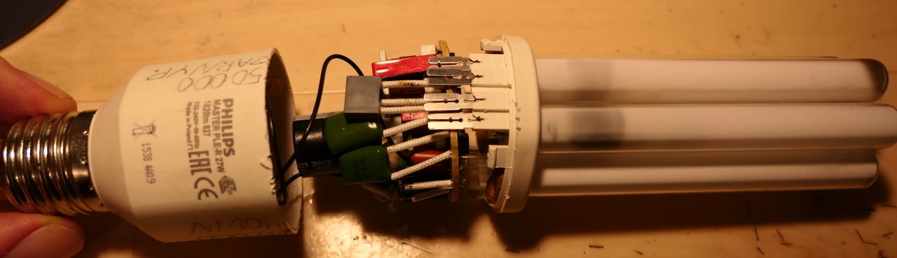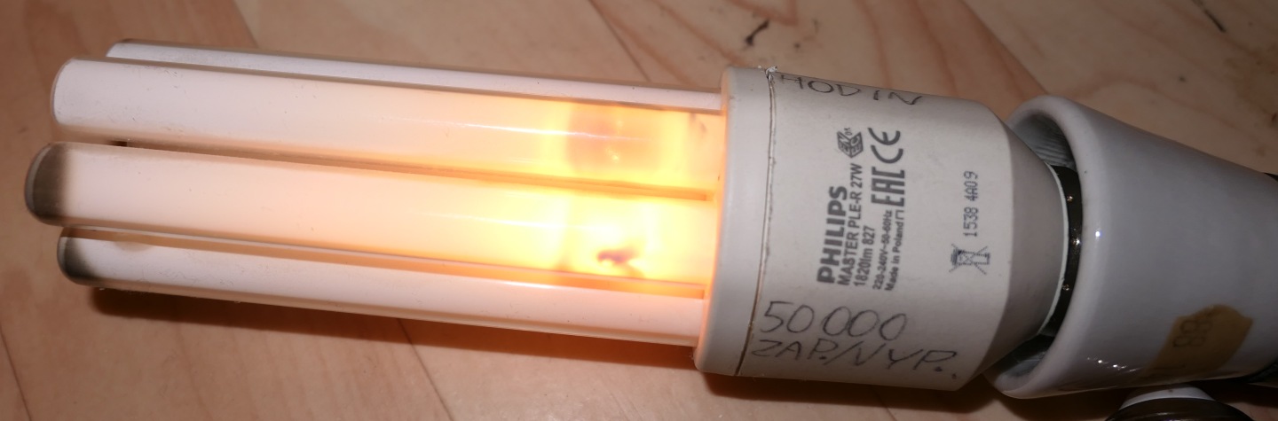 Zkoumal jsem vadnou úsporku Philips MASTER PLE-R 27W. V provozu byla od února 2016 asi do listopadu 2021. Přitom měla dle výrobce vydržet 20 000 hodin a 50 000 cyklů zapnuto / vypnuto.