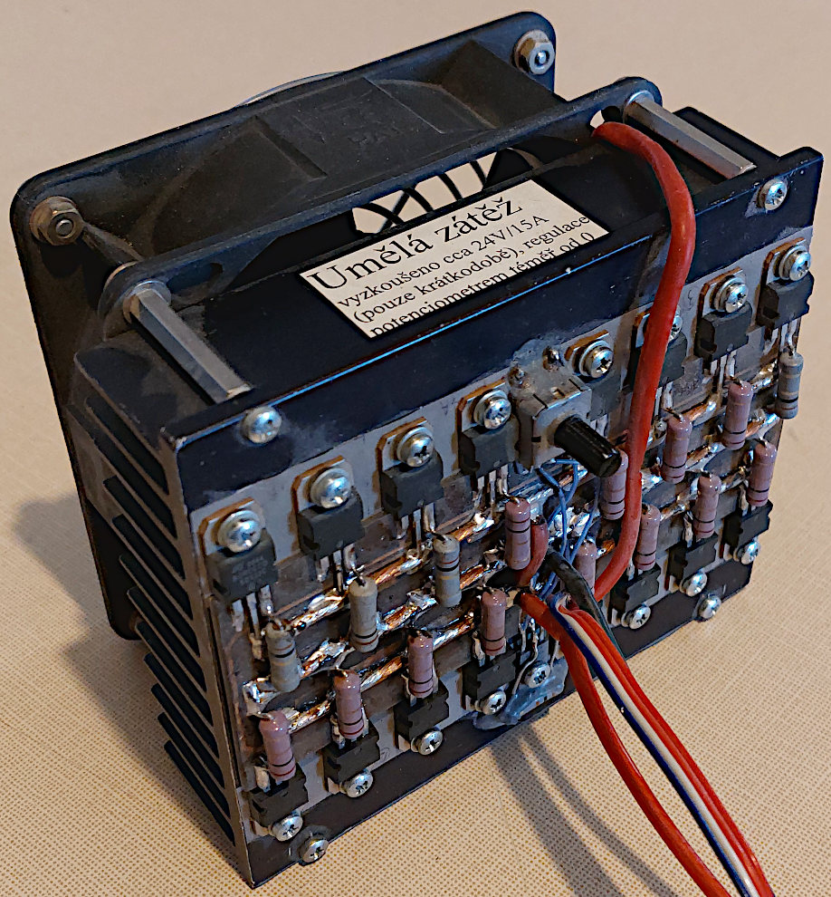 Asi před rokem jsem usmažil umělou zátěž, co jsem si postavil někdy před 15 lety. Nedařilo se mi do ní již sehnat použitej "vypalovací" FET Tesla KUN05 a tak skončila v regálu na "někdy". Někdy je tady, potřebuju z ní potejrat chování jednoho zdroje. Schema je v dole. KUN05 se sice zase dá sehnat ale když to bude rozkuchaný, chtěl bych zátěž posílit nějakým lepším FETem. Zbyl mě tu po něčem jeden STP75NF75, což je 300W, 75V, 80A, 0,009R. Původní KUN05 měl jen 70W, 50V, 12A, 0,1R. Na původní chladič bych dal aktivní chlazení, dva 40 mm větráky spínaný bimetal termostatem. No a trochu si pohrát s odpory v S-ku.